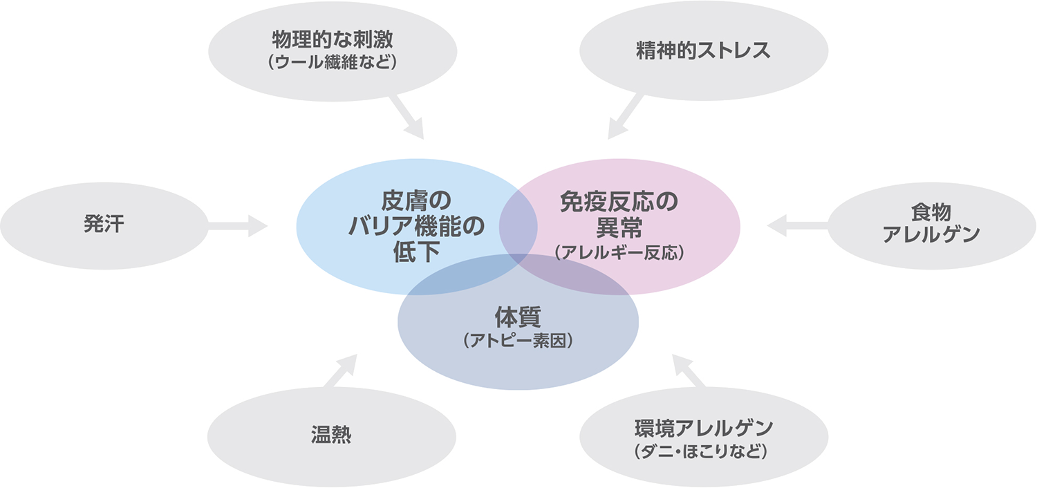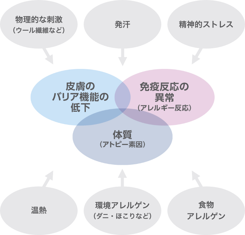 また最近では、アトピー性皮膚炎の原因にはアレルギー機序のみだけではなく、皮膚のバリア機能障害が大きく関与していることがわかってきました。よって保湿することの重要性があらためて再認識されています。